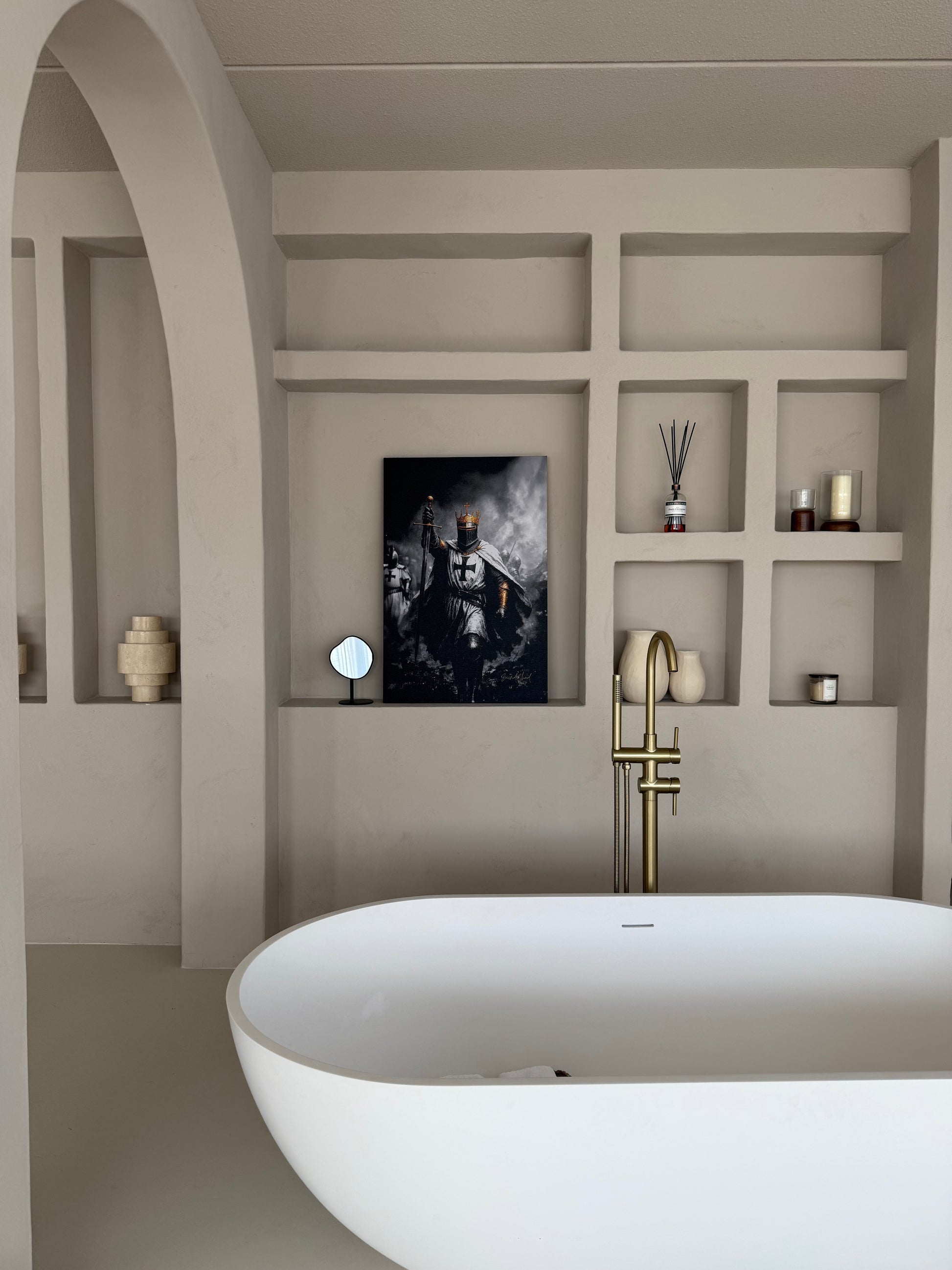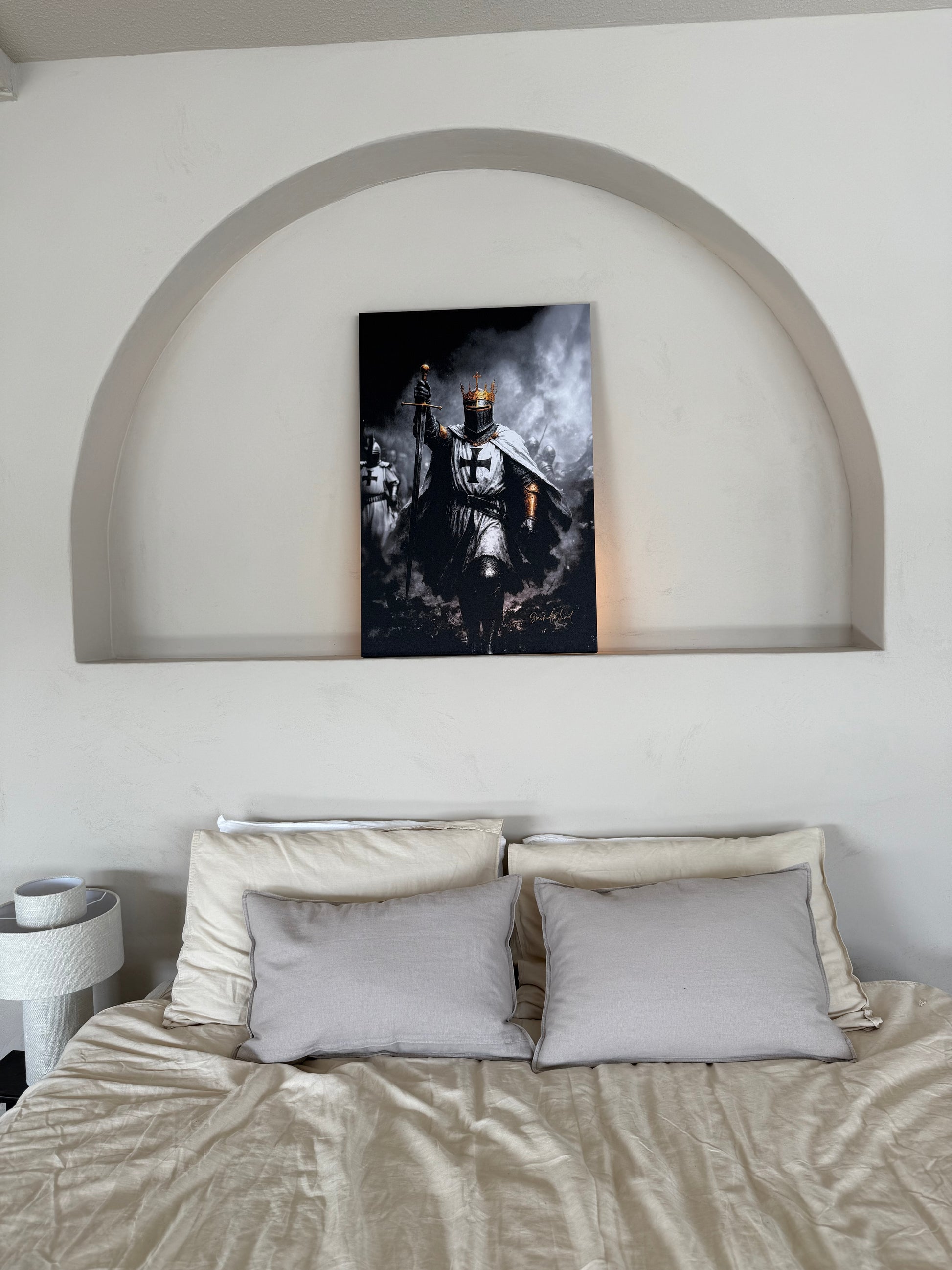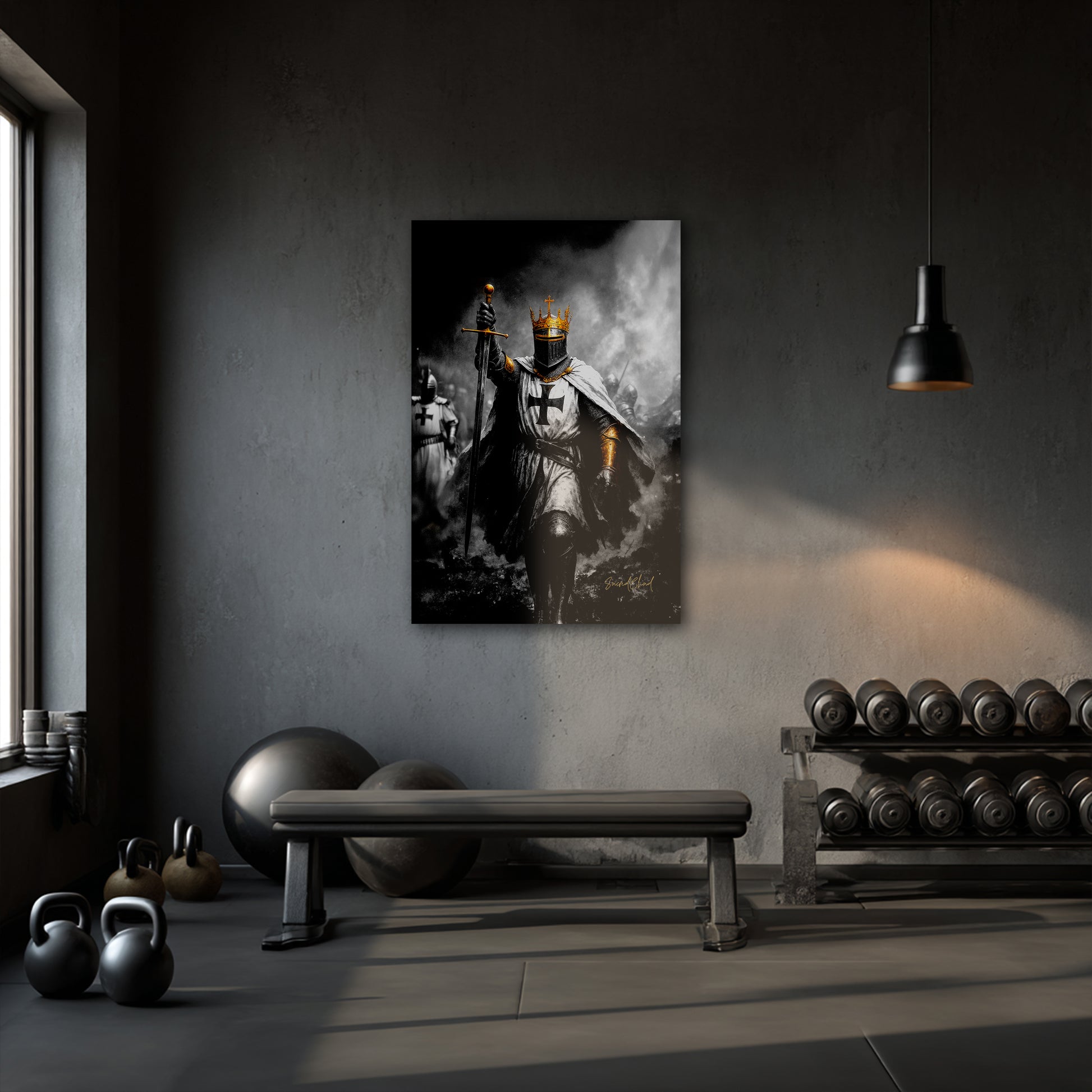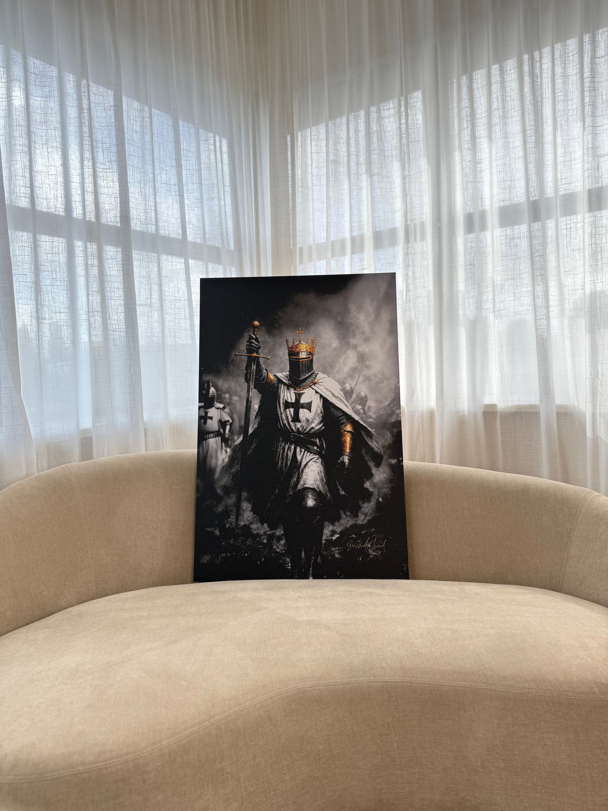 A crusader stands tall, sword raised high, ready to fight for Christ and defend the Holy Land. Inspired by the battle cry "Deus Vult" meaning: “God wills it”.