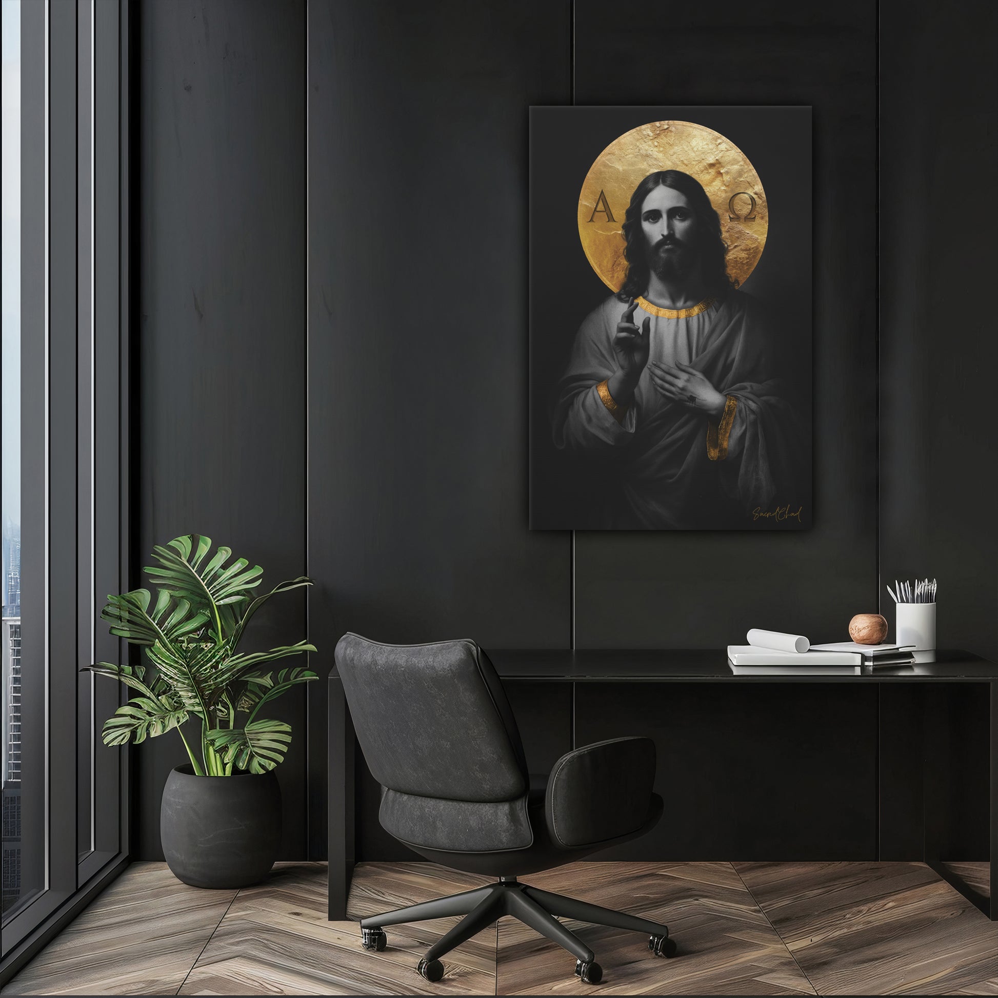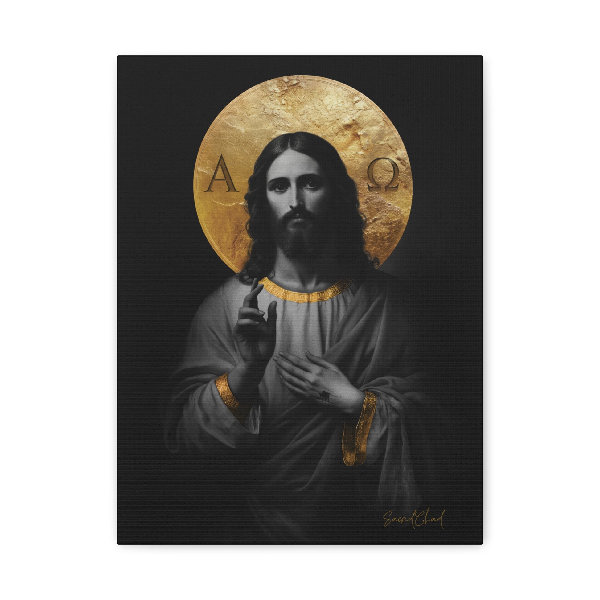 A highly realistic digital portrait of Jesus Christ, featuring a Byzantine-inspired golden halo inscribed with the letters Alpha and Omega. His hand is raised in the traditional gesture of peace and blessing, symbolizing His eternal divinity and authority. Digitally made by the SacredChad team.