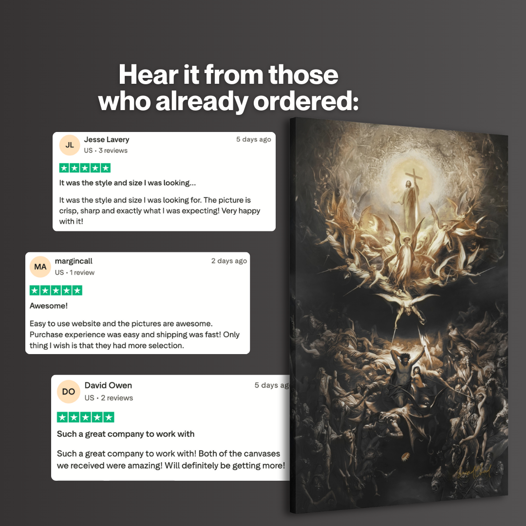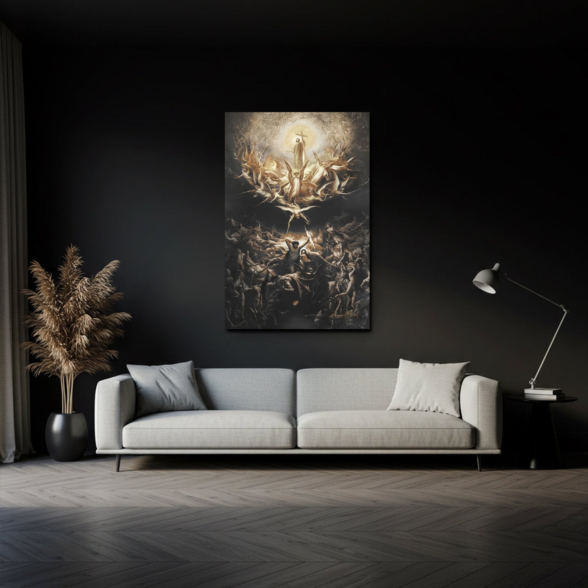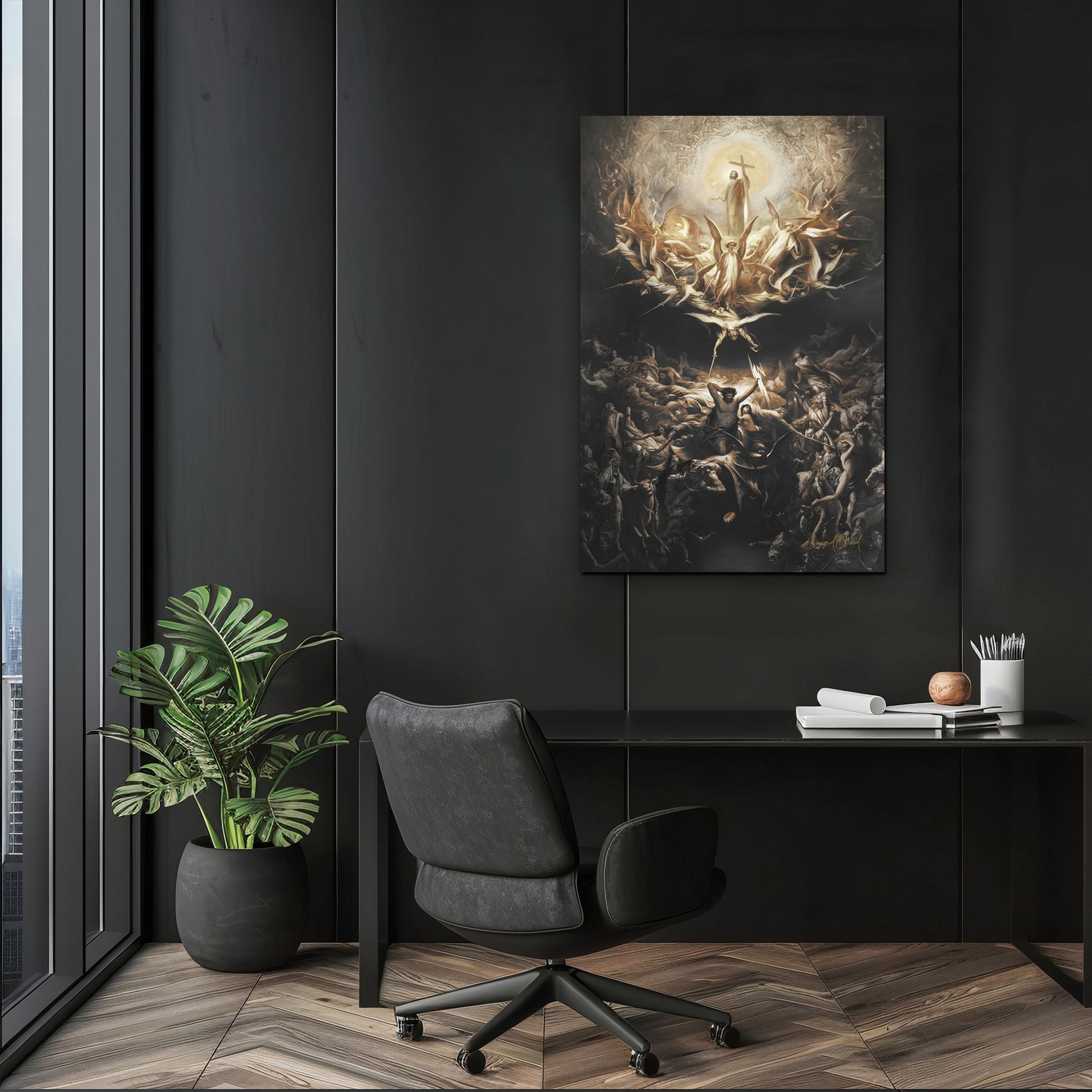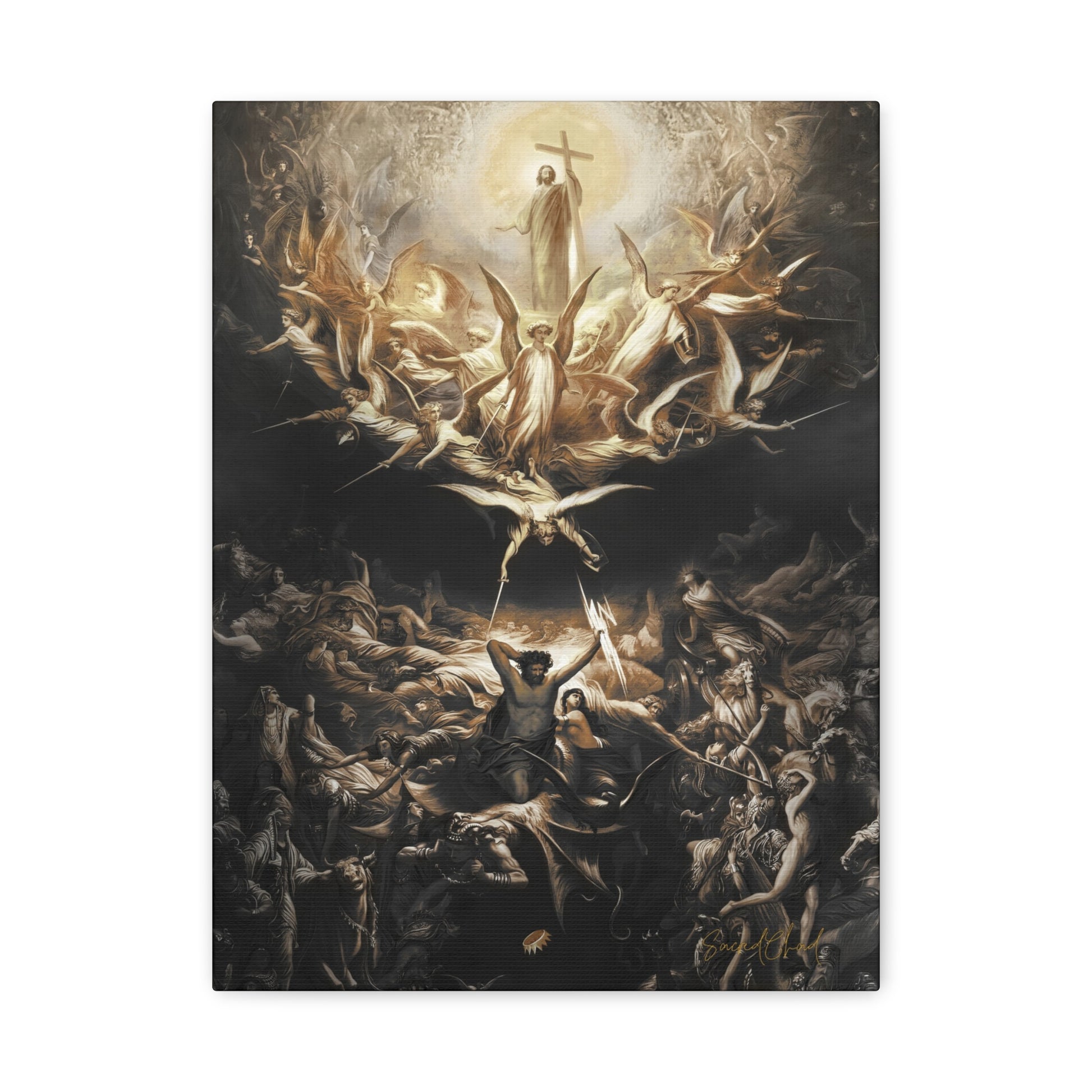 A classic masterpiece by Gustave Doré from 1886, depicting Heaven’s triumph over all darkness and false gods. At the top, Jesus Christ shines in glory, holding the cross, surrounded by His heavenly host. In the center, St. Michael the Archangel leads the charge against the powers of deception. Below lie the defeated figures like Zeus, Hera, Cronus, Helios, and Satan himself. A breathtaking vision of divine victory and eternal truth.