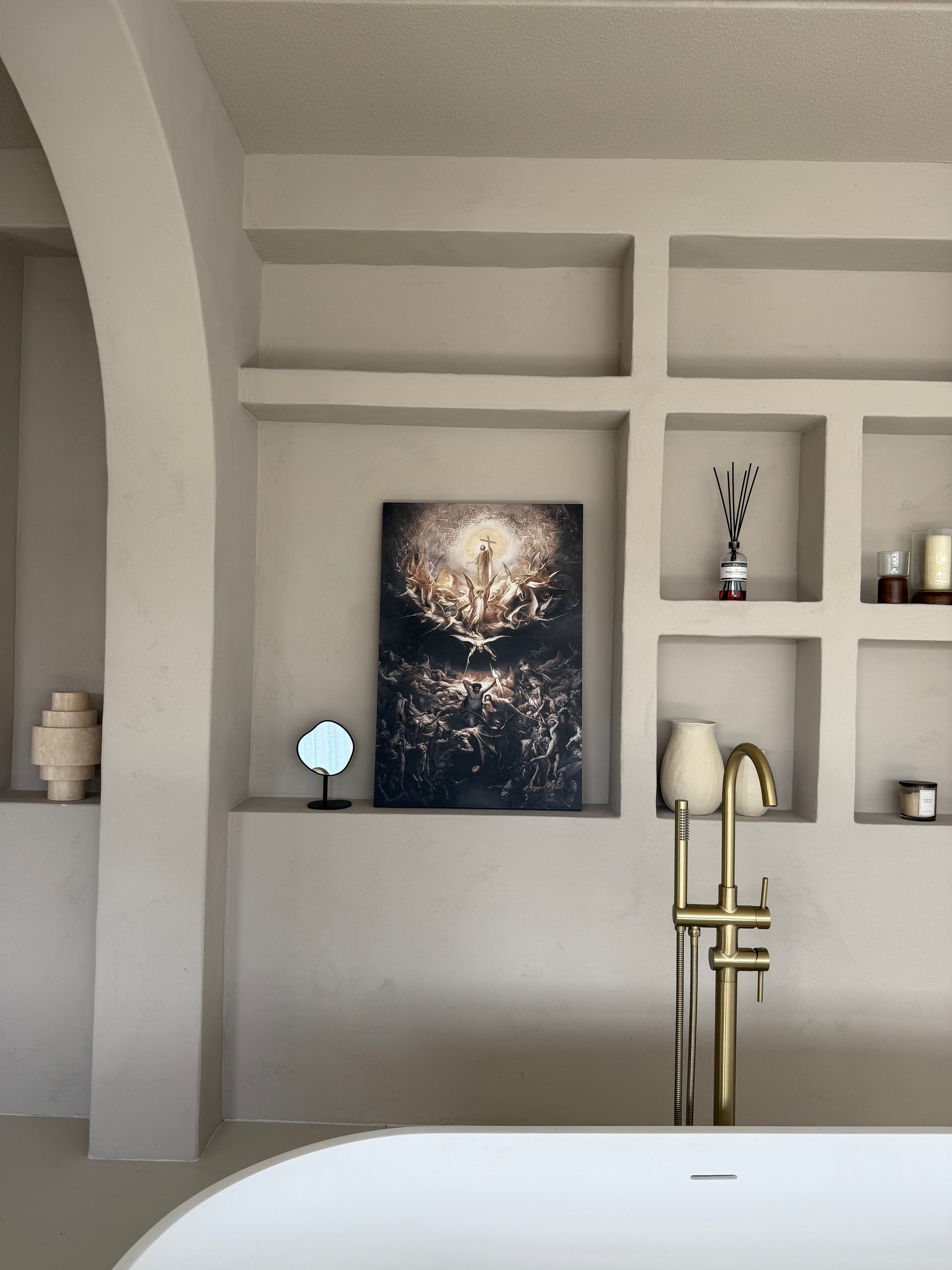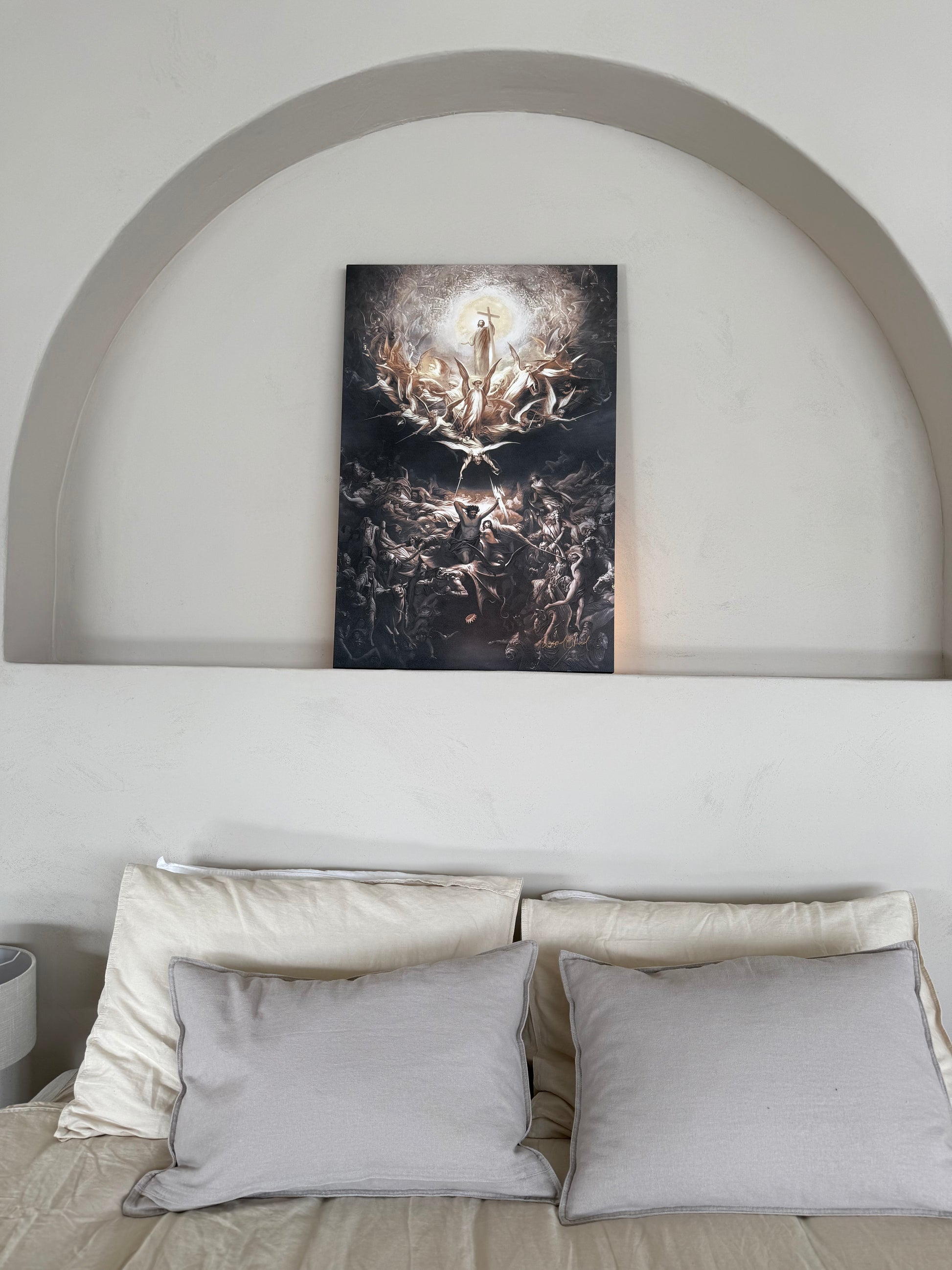 Stretched on a custom profile frame, made from FSC-certified pine wood sourced from renewable forests.